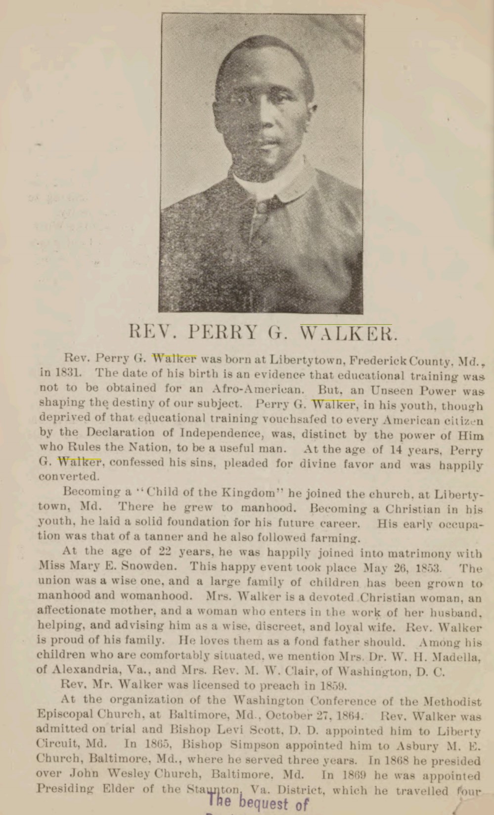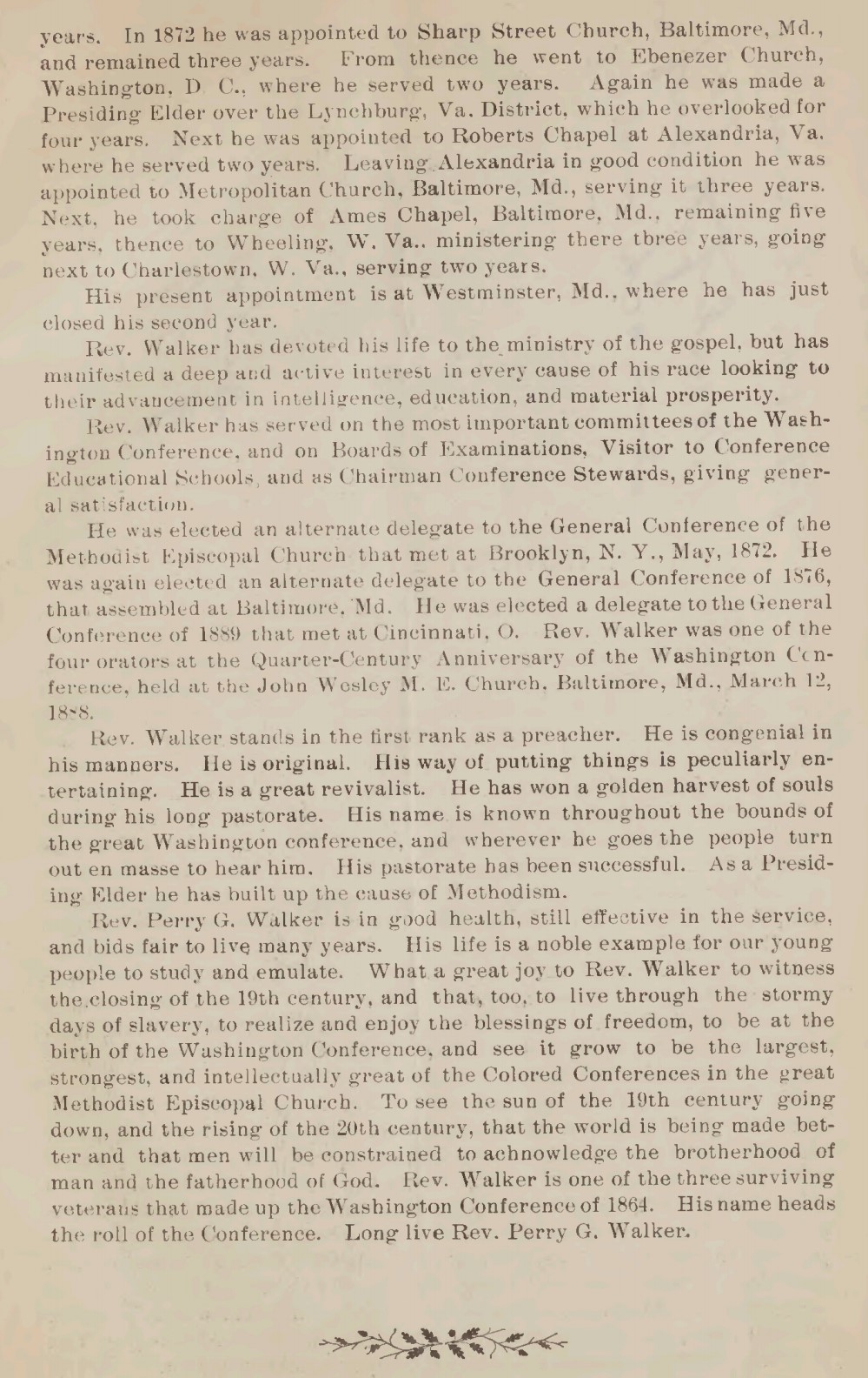 He helped form the Washington Methodist Conference, which first met in 1864. In 1873, Rev Walker was the pastor of a congregation of over 1,400 people at the Sharp Street church in Baltimore. Over the years, he lived & preached in Maryland, Virginia and Washington, DC.